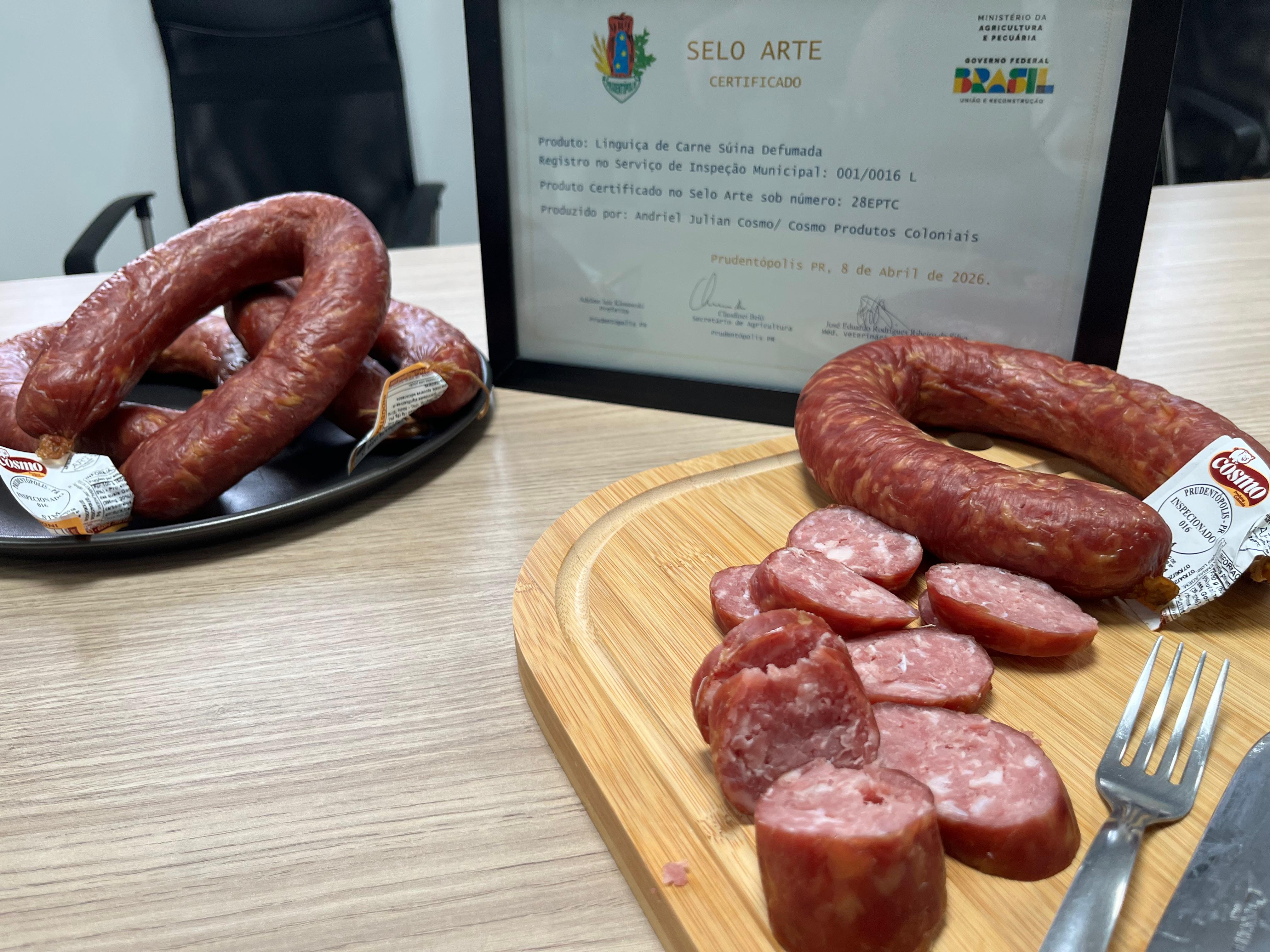 A linguiça pura, da Cosmo Produtos Coloniais, tornou-se o primeiro produto de uma agroindústria de Prudentópolis a conquistar o Selo Arte. A entrega simbólica foi realizada na manhã de hoje, 08, na Prefeitura Municipal. Com a certificação, a agroindústria passa a ser a primeira, entre as 17 agroindústrias de Prudentópolis, a ter autorização para comercializar o produto em todo território nacional.